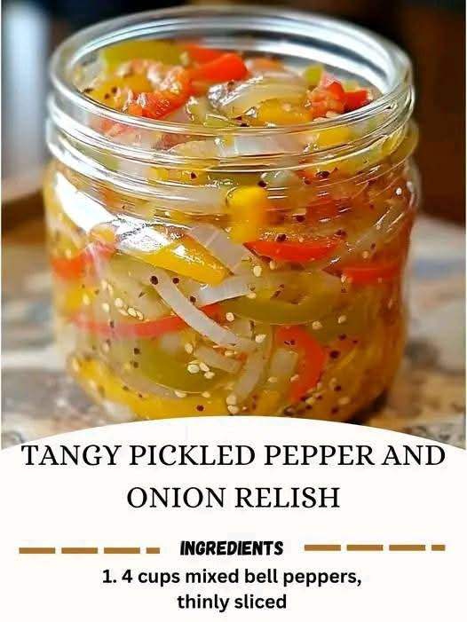 1. 4 cups mixed bell peppers, thinly sliced2. 2 large onions, thinly sliced3. 1 cup white vinegar4. 1 cup apple cider vinegar5. 1 cup granulated sugar6. 1 tablespoon mustard seeds7. 1 teaspoon celery seeds8. 1 teaspoon turmeric powder9. 1 teaspoon salt10. 1/2 teaspoon ground black pepper11. 1/2 teaspoon red pepper flakes (optional)Directions:1. Preparing the Pickled Pepper and Onion Relish: 1.1. In a large saucepan, combine the white vinegar, apple cider vinegar, granulated sugar, mustard seeds, celery seeds, turmeric powder, salt, black pepper, and red pepper flakes (if using). 1.2. Bring the mixture to a boil over medium heat, stirring occasionally until the sugar dissolves. 1.3. Add the sliced bell peppers and onions to the saucepan, stirring to coat them in the vinegar mixture. 1.4. Reduce the heat and simmer the relish for about 10-15 minutes, or until the peppers and onions are slightly softened but still retain some crunch. 1.5. Remove the saucepan from the heat and let the relish cool to room temperature.2. Storing the Relish: 2.1. Transfer the pickled pepper and onion relish to clean, sterilized jars with airtight lids. 2.2. Seal the jars tightly and refrigerate the relish for at least 24 hours before serving to allow the flavors to meld together. 2.3. The relish can be stored in the refrigerator for up to 2 weeks.3. Serving Suggestions: 3.1. Enjoy the tangy pickled pepper and onion relish as a condiment with sandwiches, burgers, hot dogs, grilled meats, or as a topping for salads. 3.2. Get creative and use it to add a zesty kick to your favorite dishes!Preparation Time: 15 minutes | Cooking Time: 15 minutes | Total Time: 30 minutes | Servings: Makes about 4 cups of relish