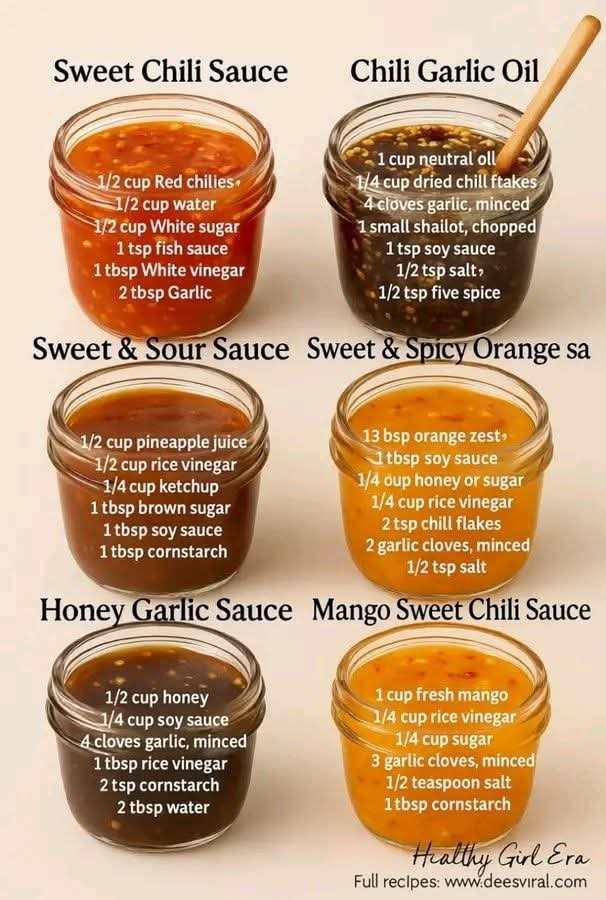 *Honey Garlic Glaze* Ingredients: 1/2 cup honey 1/4 cup soy sauce 4 cloves garlic, minced 1 tablespoon rice vinegar 1 tablespoon cornstarch (optional) 2 tablespoons water 1 teaspoon fresh ginger (optional)Instructions: In a saucepan, combine all ingredients except cornstarch and water. Simmer for 4-5 minutes. If thickening, mix cornstarch and water to make a slurry, then stir it in. Simmer another 1-2 minutes. Cool slightly before using.Sweet and Sour Sauce Ingredients: 1/2 cup pineapple juice 1/4 cup rice vinegar 1/4 cup ketchup 1/3 cup brown sugar 1 tablespoon soy sauce 1 tablespoon cornstarch 2 tablespoons waterInstructions: In a saucepan, whisk pineapple juice, vinegar, ketchup, sugar, and soy sauce. Bring to a gentle boil. Mix cornstarch and water, then stir into the sauce until thick and glossy. Cool before storing.Sweet and Spicy Orange Sauce Ingredients: 1/2 cup orange juice 1 tablespoon orange zest 2 tablespoons soy sauce 1/4 cup honey or sugar 2 tablespoons vinegar 1-2 teaspoons chili flakes or sriracha 2 garlic cloves, minced 1 teaspoon fresh ginger 1 tablespoon cornstarch 2 tablespoons waterInstructions: Sauté garlic and ginger in a splash of oil. Add all other ingredients except slurry. Bring to a simmer. Mix and stir in the cornstarch slurry. Cook until thick and glossy. Cool before storing.