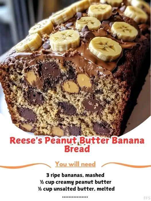 Reese’s Peanut Butter Banana BreadIngredients:For the Banana Bread:● 3 ripe bananas, mashed● ½ cup creamy peanut butter● ⅓ cup unsalted butter, melted● ½ cup granulated sugar● ½ cup brown sugar, packed● 2 large eggs● 1 tsp vanilla extract● 1 ¾ cups all-purpose flour● 1 tsp baking soda● ½ tsp salt● ½ cup milk (or buttermilk for extra richness)● 1 cup chopped Reese’s Peanut Butter Cups● ½ cup Reese’s Pieces (optional for extra crunch & color)Instructions:Prep & Mix1. Preheat oven to 350°F (175°C). Grease a 9×5-inch loaf pan or line with parchment paper.2. In a bowl, whisk together flour, baking soda, and salt; set aside.3. In another bowl, mash the bananas, then mix in peanut butter, melted butter, sugars, eggs, and vanilla until smooth.4. Gradually add the dry ingredients, alternating with milk, mixing until just combined.Fold in the Reese’s5. Gently fold in chopped Reese’s Peanut Butter Cups and Reese’s Pieces.Bake to Perfection6. Pour batter into the prepared loaf pan and smooth the top.7. Bake for 55-65 minutes, or until a toothpick inserted in the center comes out clean.8. Let cool in the pan for 10 minutes, then transfer to a wire rack.Optional Peanut Butter Drizzle9. Melt ¼ cup peanut butter and drizzle over the cooled bread for extra goodness!