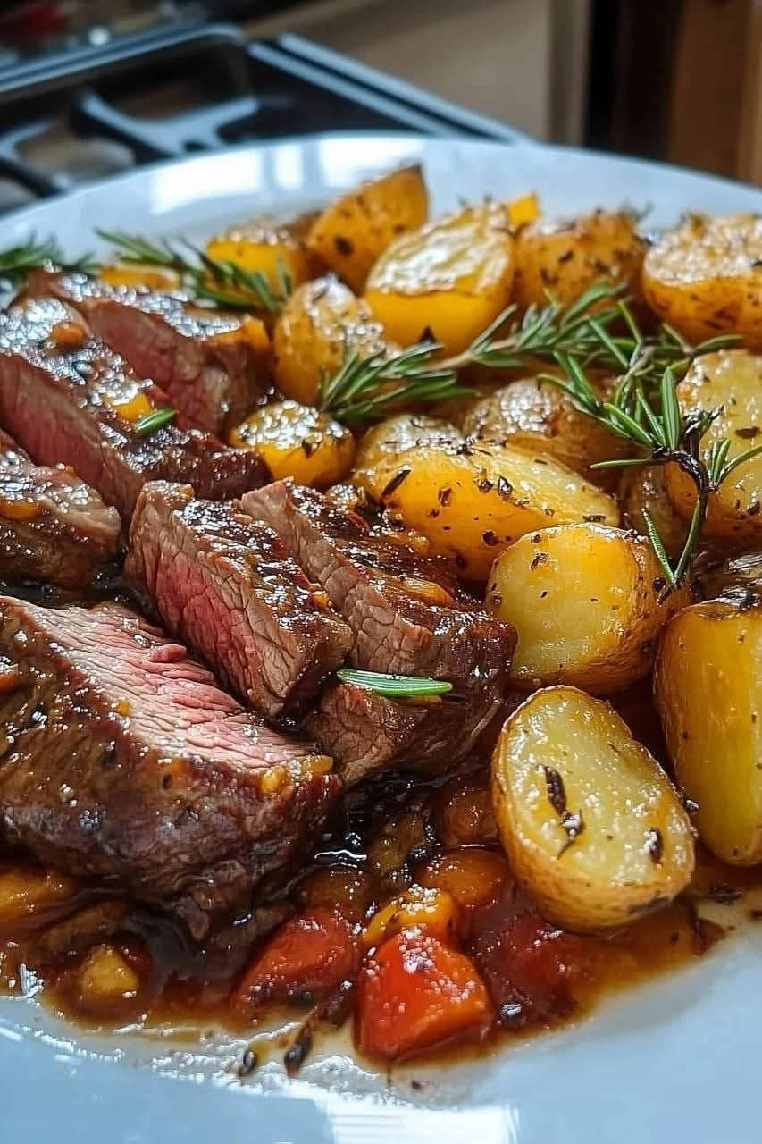 This version pairs honey-glazed beef strips with golden, herby roasted potatoes, offering both hearty comfort and restaurant-quality flavor in one simple, satisfying meal.
