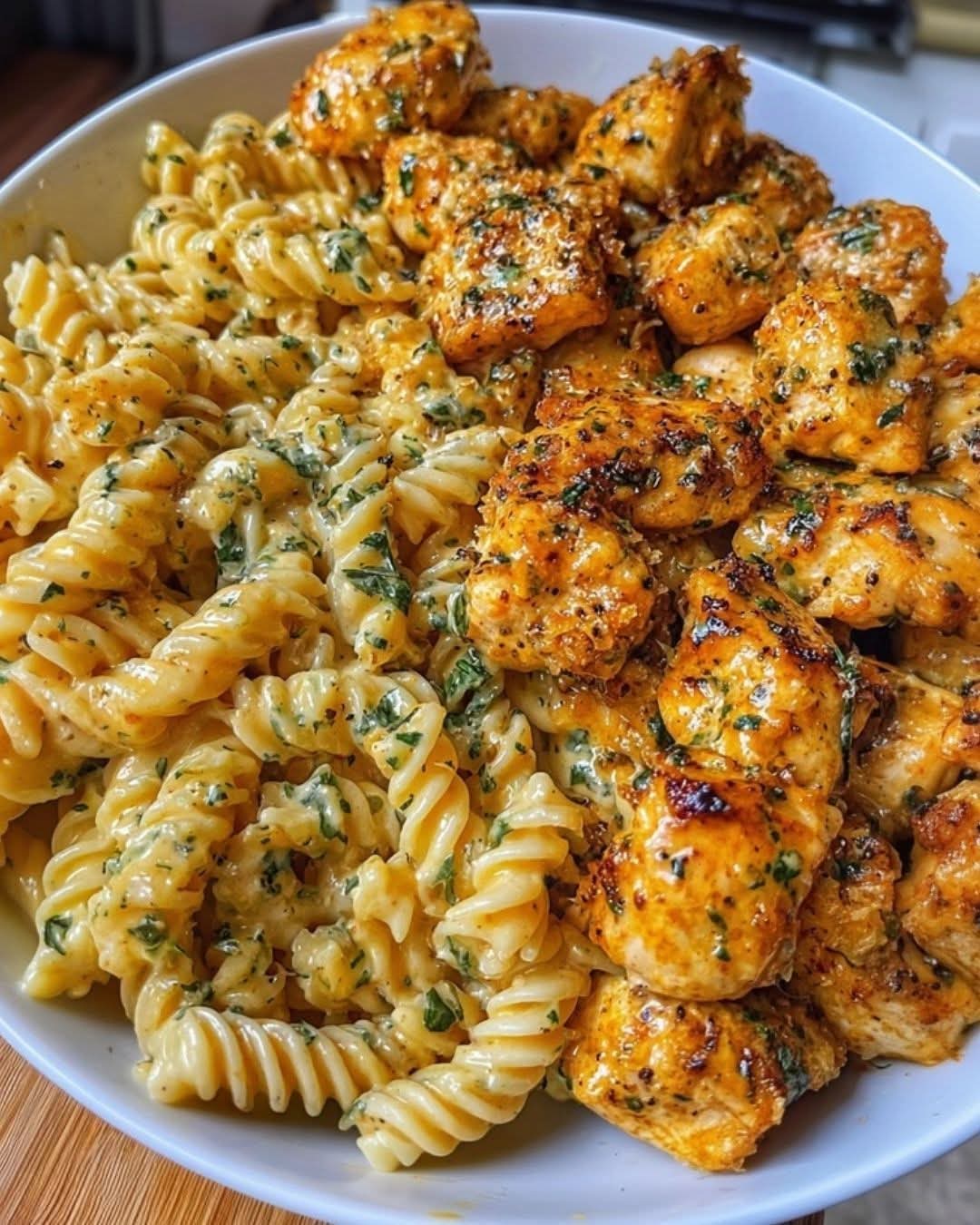 🍗🧄 Garlic Parmesan Chicken Bites with Creamy Rotini 🧄🍗